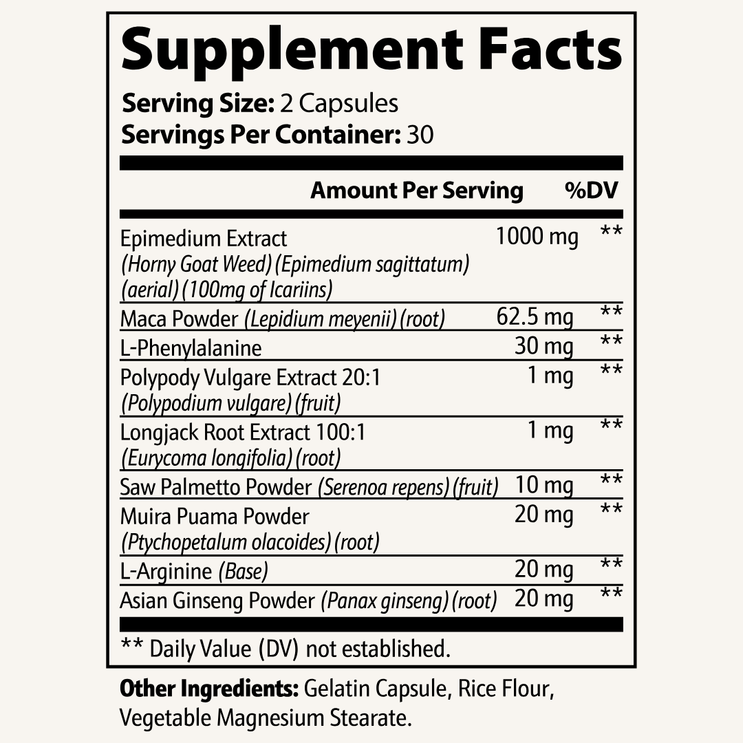 Reignite your passion and confidence naturally. Anchored by potent extracts of Horny Goat Weed and Maca Root, this formula supports sexual health and desire. These time-tested herbs work together to revitalize your drive and readiness for intimate moments.