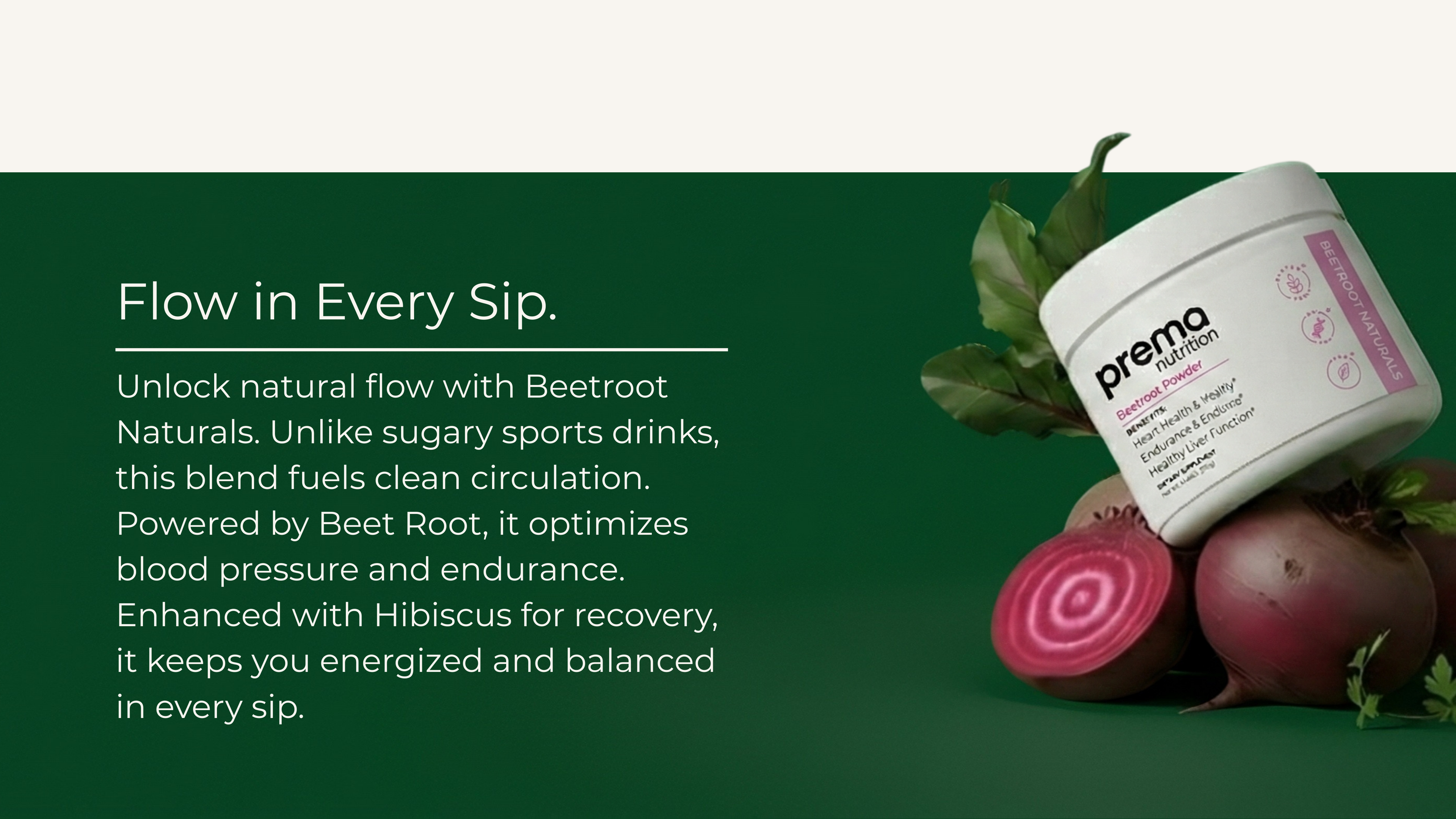 Beetroot Naturals blends beet root, hibiscus flower, and apple juice powder, lightly sweetened with stevia. It's designed to support healthy blood flow, cardiovascular wellness, and post-workout recovery—all in a refreshing, easy-to-mix daily drink