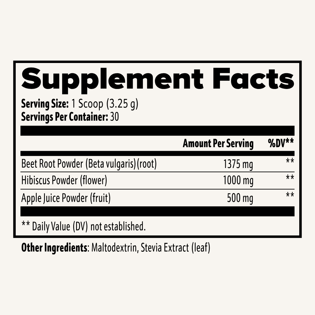 Beetroot is rich in dietary nitrates, which the body converts into nitric oxide—a molecule that relaxes blood vessels, supporting healthy circulation and normal blood pressure. Hibiscus adds support for cardiovascular health, while apple juice contributes natural sweetness and additional antioxidants. Together, this trio delivers a functional and flavorful boost for active, heart-centered living.